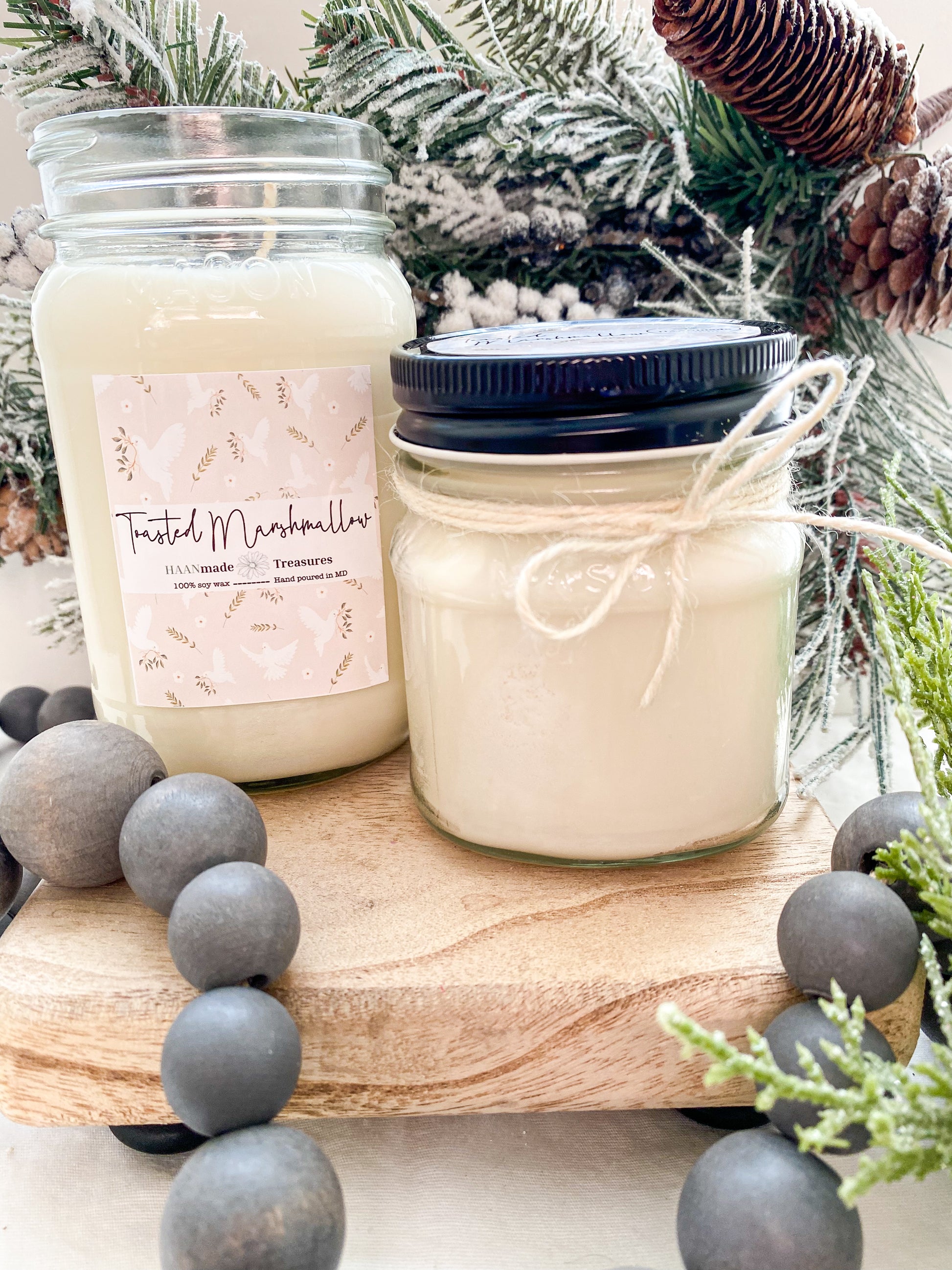 All HAANmade candles are made with 100% all natural soy wax and are hand poured in Maryland. I choose soy wax because agriculture is a huge part of my life. Soy candles are great because they are all natural, creating a cleaner burn. Unlike paraffin candles, soy candles do not release harmful chemicals into the air while burning. Some variations in appearance may occur in candles with each pour, but don't worry as these variations do not affect the smell.